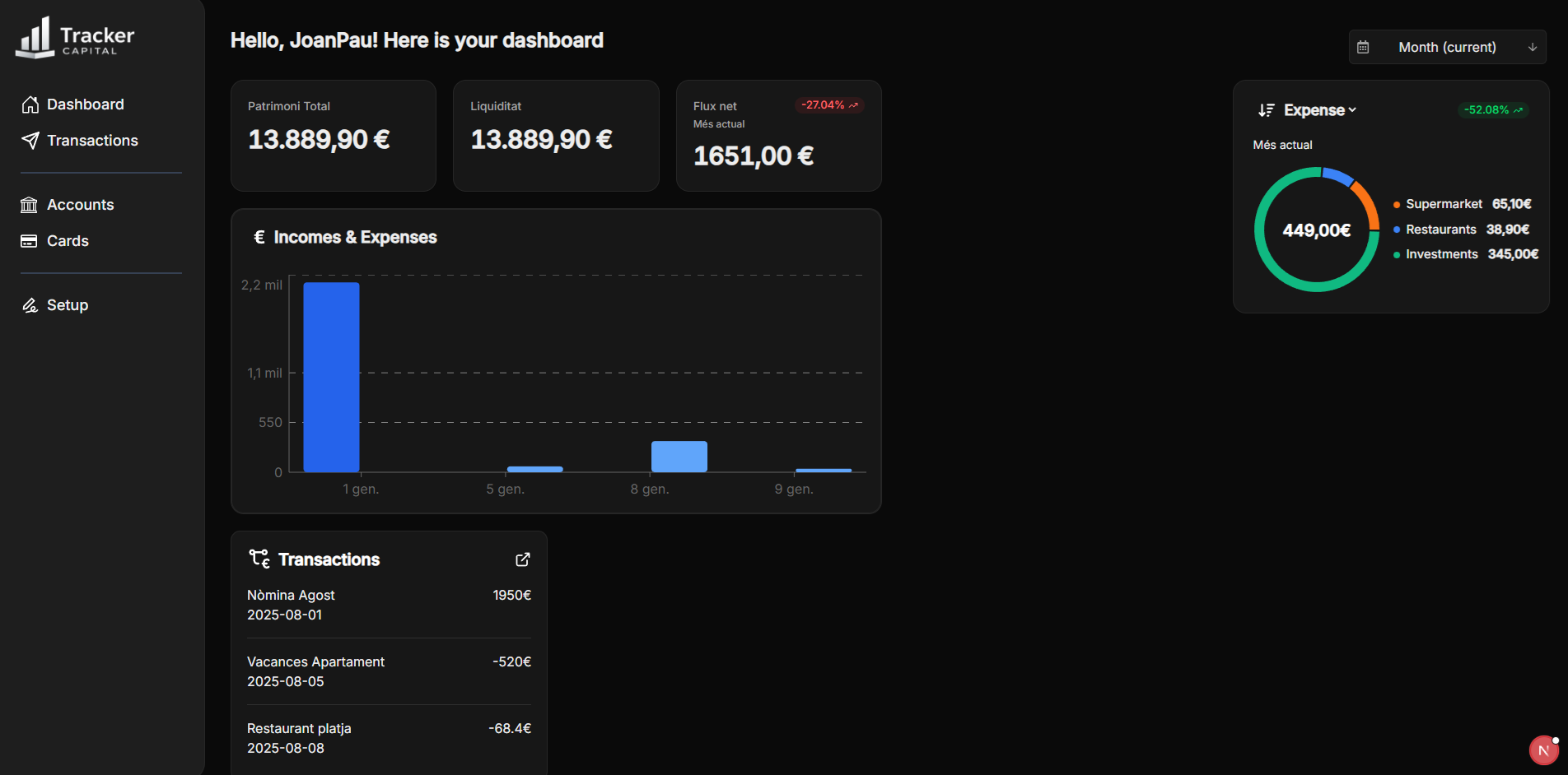 Al conectar tu cuenta bancaria, Traker Capital sincroniza automáticamente tus movimientos para que no tengas que introducir gastos manualmente. Toda tu información se actualiza en tiempo real y siempre tienes una visión clara y actualizada de tus finanzas.